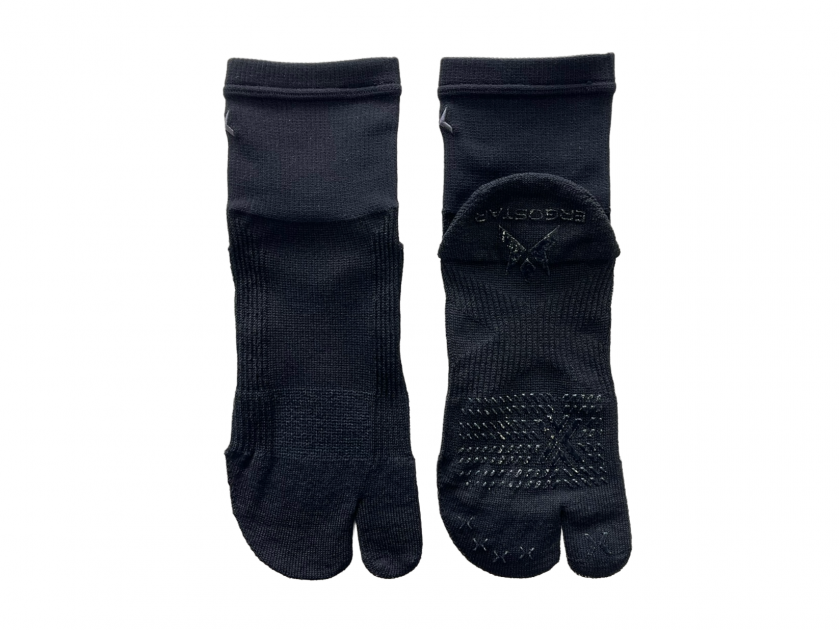 クロステーピングソックスのタビ型ミドル丈モデル。素材にエルゴスター独自の”紙糸”を使用しています。シャリ感のある独特の肌触りで、濡れてもべたつかず、ドライな履き心地が続きます。高い吸放湿性で蒸れを抑え、マメなどのスキントラブルも防ぎます。くるぶしをしっかりと覆う安心感のある丈の長さで、ロングタイツやゲイターとの隙間も開きません。ドライな履き心地の紙糸は足首から下だけに使用。足首から上は柔らかく強度のあるナイロン糸に切り替えています。